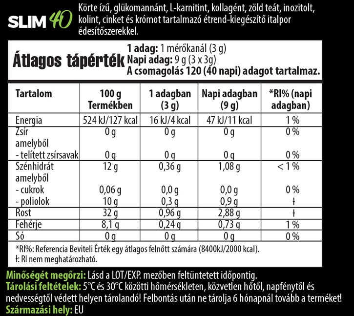 A SLIM40 nem minősül gyógyszernek, az étrend-kiegészítők fogyasztása nem helyettesíti a kiegyensúlyozott, változatos, vegyes étrendet és az egészséges életmódot.